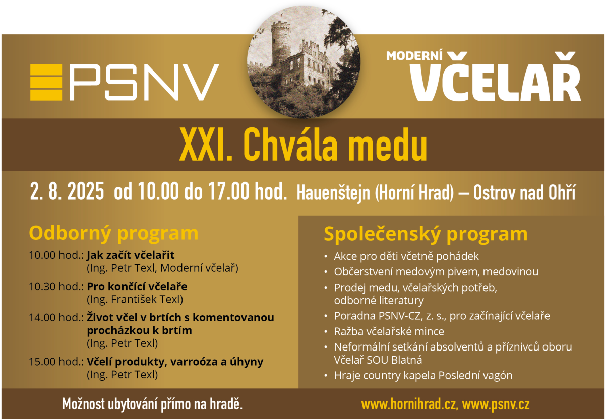 Letošní 21. ročník akce Chvála medu se koná v sobotu 2. srpna 2025 od 10 do 17 hodin na Horním hradě u Ostrova nad Ohří (okres Karlovy Vary). Horní hrad, zvaný též Hauenštejn, zasazený do svahů Krušných hor, nabízí kromě prohlídky působivého areálu návštěvu obnoveného historického arboreta.