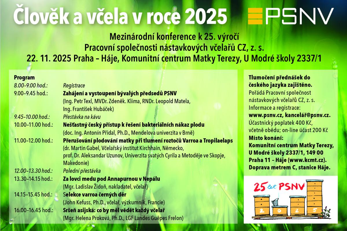 Pracovní společnost nástavkových včelařů CZ, z. s. pořádá 22. listopadu 2025 mezinárodní konferenci "Člověk a včela v roce 2025" k 25. výročí svého vzniku. Akce je možné se zúčastnit prezenčně (jiná registrace) nebo ONLINE.